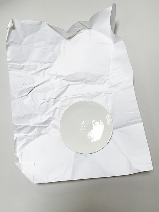 Handmade glazed porcelaine plate wrapped in offset print on Muken Print White 1.5