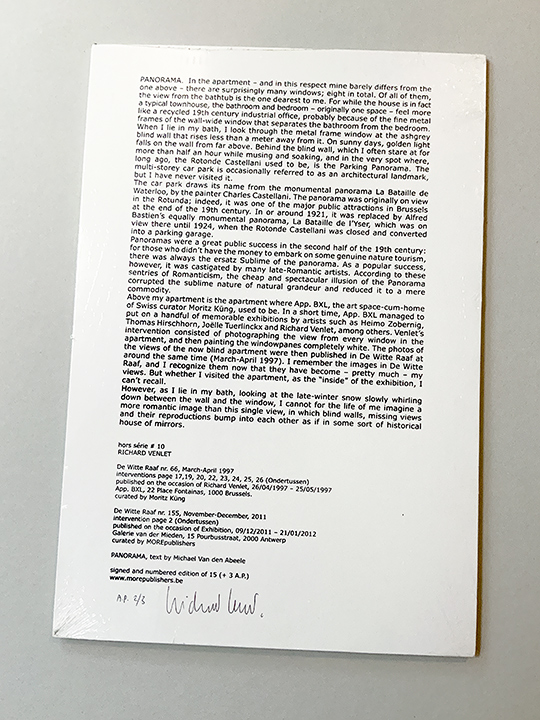 Above my apartment is the apartment where App. BXL, the art space-cum-home of Swiss curator Moritz Kung, used to be. In a short time, App. BXL managed to put on a handful of memorable exhibitions by artists such as Heimo Zobernig, Thomas Hirschhorn, Joëlle Tuerlinckx and Richard Venlet, among others. Venlet's intervention consisted of photographing the view from every window in the apartment, and then painting the windowpanes completely white. The photos of the views of the now blind apartment were then published in De Witte Raaf at around the same time (March-April 1997). I remember the images in De Witte Raaf, and I recognize them now that they have become – pretty much – my views. But whether I visited the apartment, as the “inside” of the exhibition, I can’t recall.