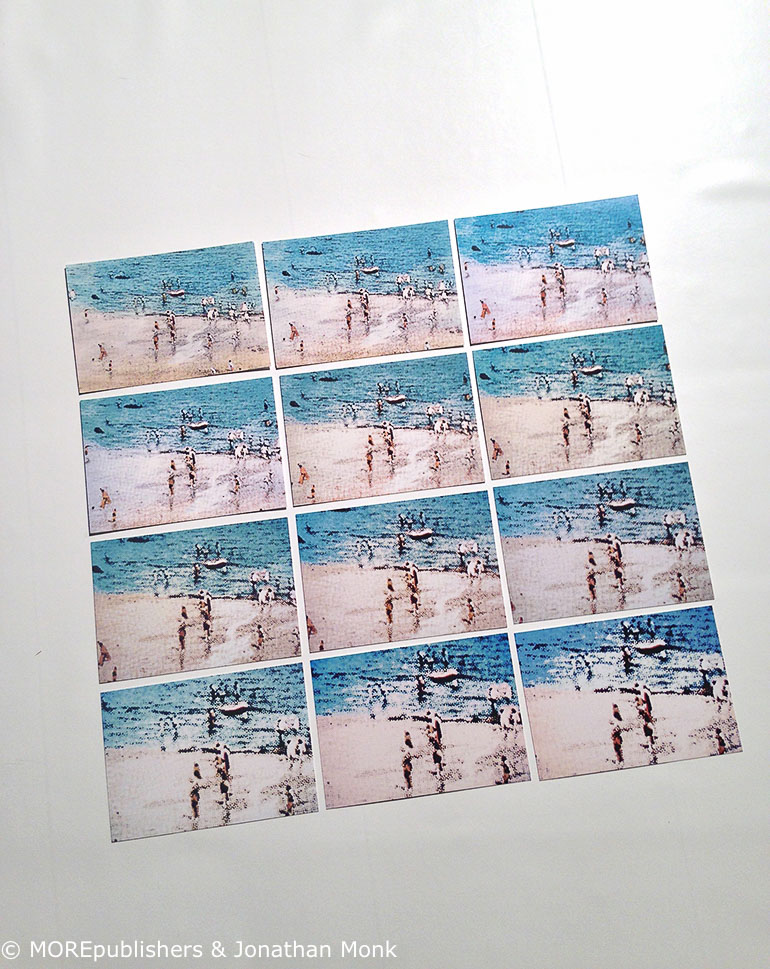 Suite of 12 postcards, after a copy of Richard Hamilton’s original hand colored postcard ‘Whitley Bay’. Each postcard is a reproduction of the previous card. Due to this reproduction- and technical proces each card looses a 3 mm margin. Therefor each card is a close-up of the previous card. Zooming in on the actual image and on all aspects of reproduction.