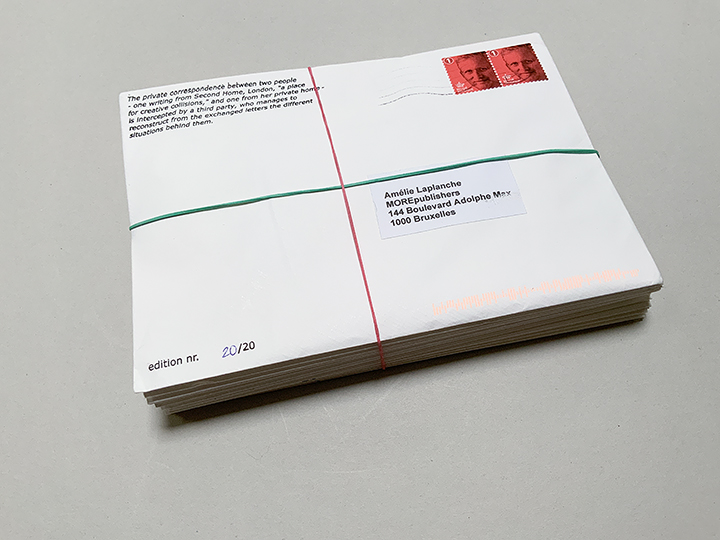 The private correspondance between two people — one writing from Second Home, London, "a place for creative collisions,” and one from her private home — is intercepted by a third party, who manages to reconstruct from the exchanged letters the different situations behind them.’