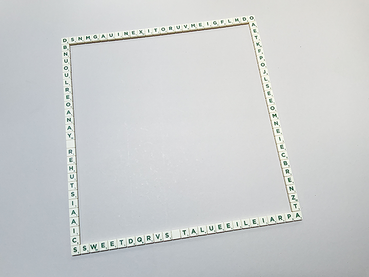 Complete set of vintage scrabble tiles (102 pieces) mounted on perspex support