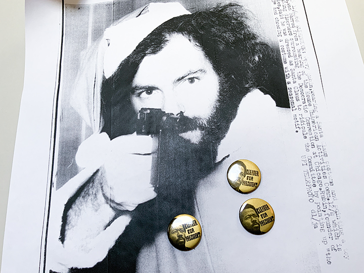 Photocopy, 3 original political pins (1968), tube with colophon