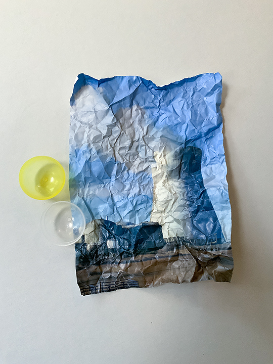 Crumpled digital print stored in a plastic ball