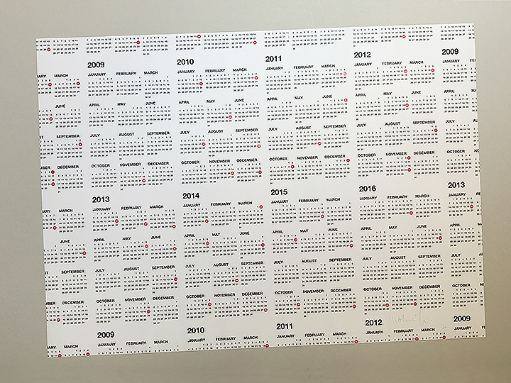 A poster designed to cover the sunday box- the poster is made of a calendar for the years 2009 until 2016, indicating all Sundays on which a sunday edition was published. The calendar is transformed into an endless motive.