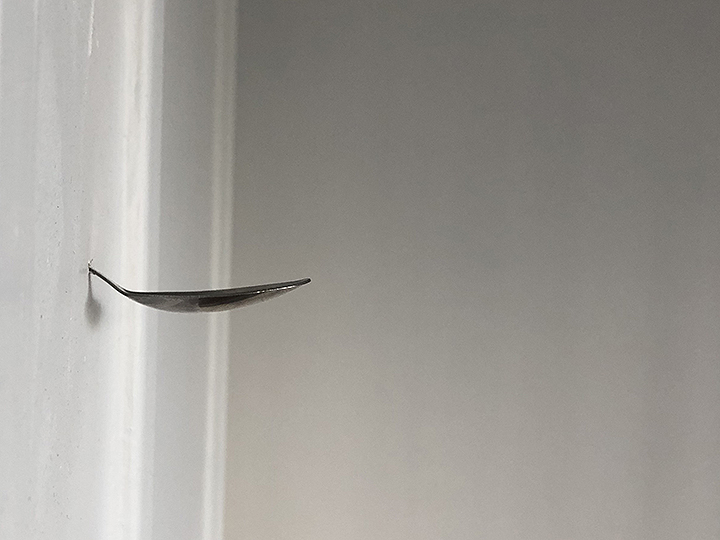 Broken metal spoon to be affixed into a mall cut in the wall, at eye level