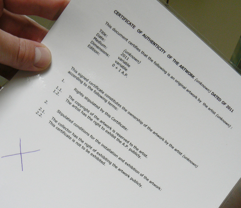 • The artist produced a certificate (edition 0 + 1 a.p.) which was presented among viewing copies of available editions.