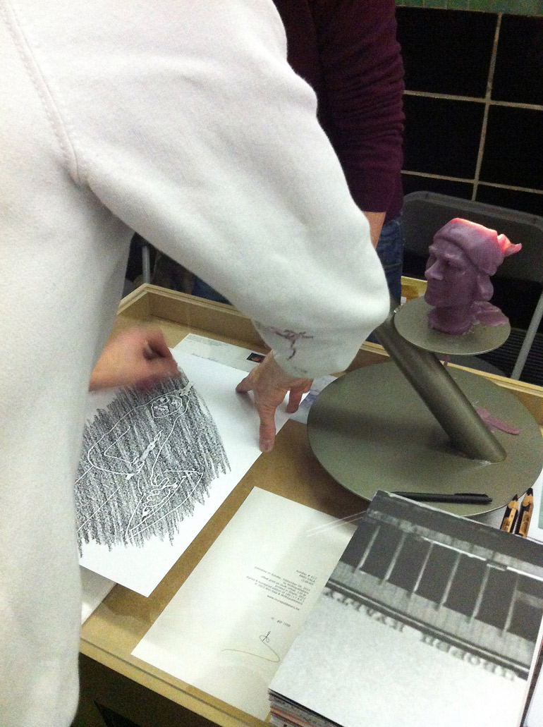• Vaast Colson proposed  to realise a display case that would become the tool to produce his Hors série # 19. Entitled "Plot Coupon" , it can only be produced when the display case is on use ; Vaast Colson's drawing would appear by rubbing a paper rightly placed on the plexiglas surface. The rubbing shows a figure/knight (Widu Gasti) holding two candles. A figure/selfportrait that occurs in several Works by Vaast Colson.