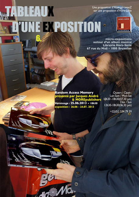 MOREpublishers was invited by Alain Geronnez to participate in his Tableaux d'un exposition series of micro exhibitions. These exhibitions were held in a glass case located in the second hand record and book store Hors-série in Brussels city center.